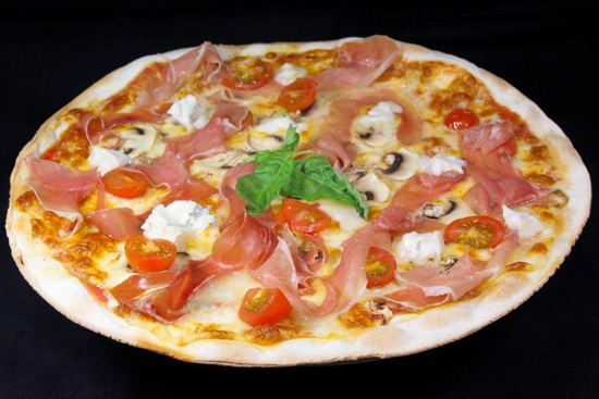 Tomàquet, mozzarella, gorgonzolla, xampinyons, nous, tomàquet cherry, pernil serrano
